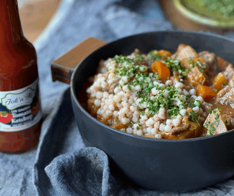 A dish packed with goodness and flavour – and all the work is done within 30 minutes, then sit back and relax. Stirring 2025 OFPA Gold Medal-winning Jo’n’ Al Tomato Ketchup into the stock-based sauce, adds depth of flavour – umami notes. You can switch out the parsnip and swede for one kumara and a handful of yams.