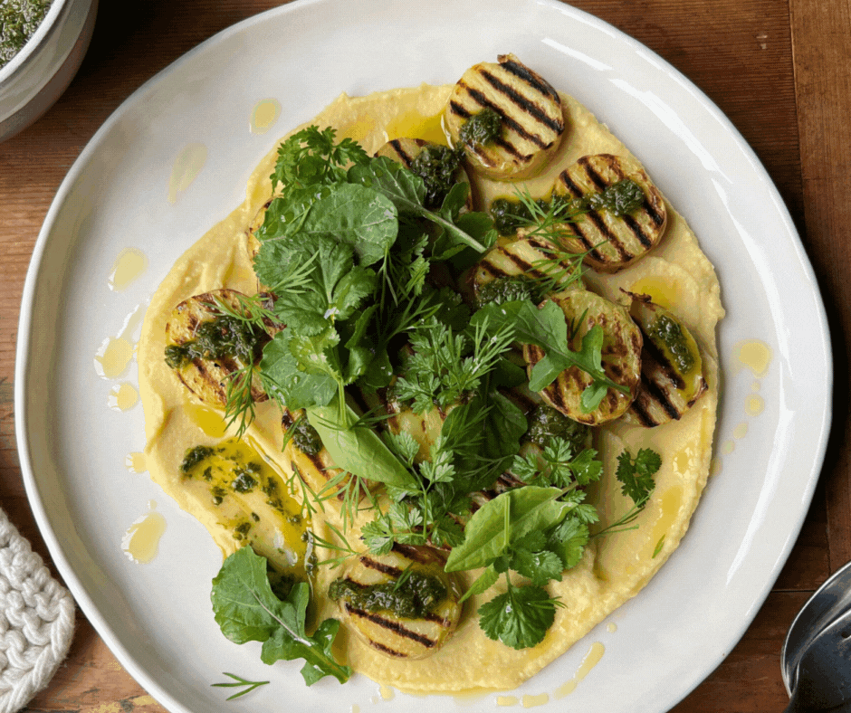 To serve, spread the chickpea puree over the bottom of a large shallow serving dish. Arrange the grilled potatoes on top, then dollop or drizzle with your Green Herb Sauce’. Thin the sauce for drizzling with extra virgin olive oil. Finish with the salad leaves and herbs. Serve straightaway.